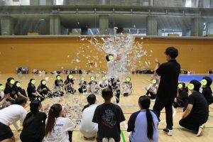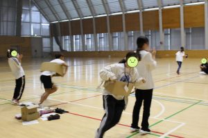 新聞紙を活用した遊びを実際に体験しながら理解を深めたのち、廃材を用いた遊びの工夫や教育的意義についてグループで議論・検討しました。